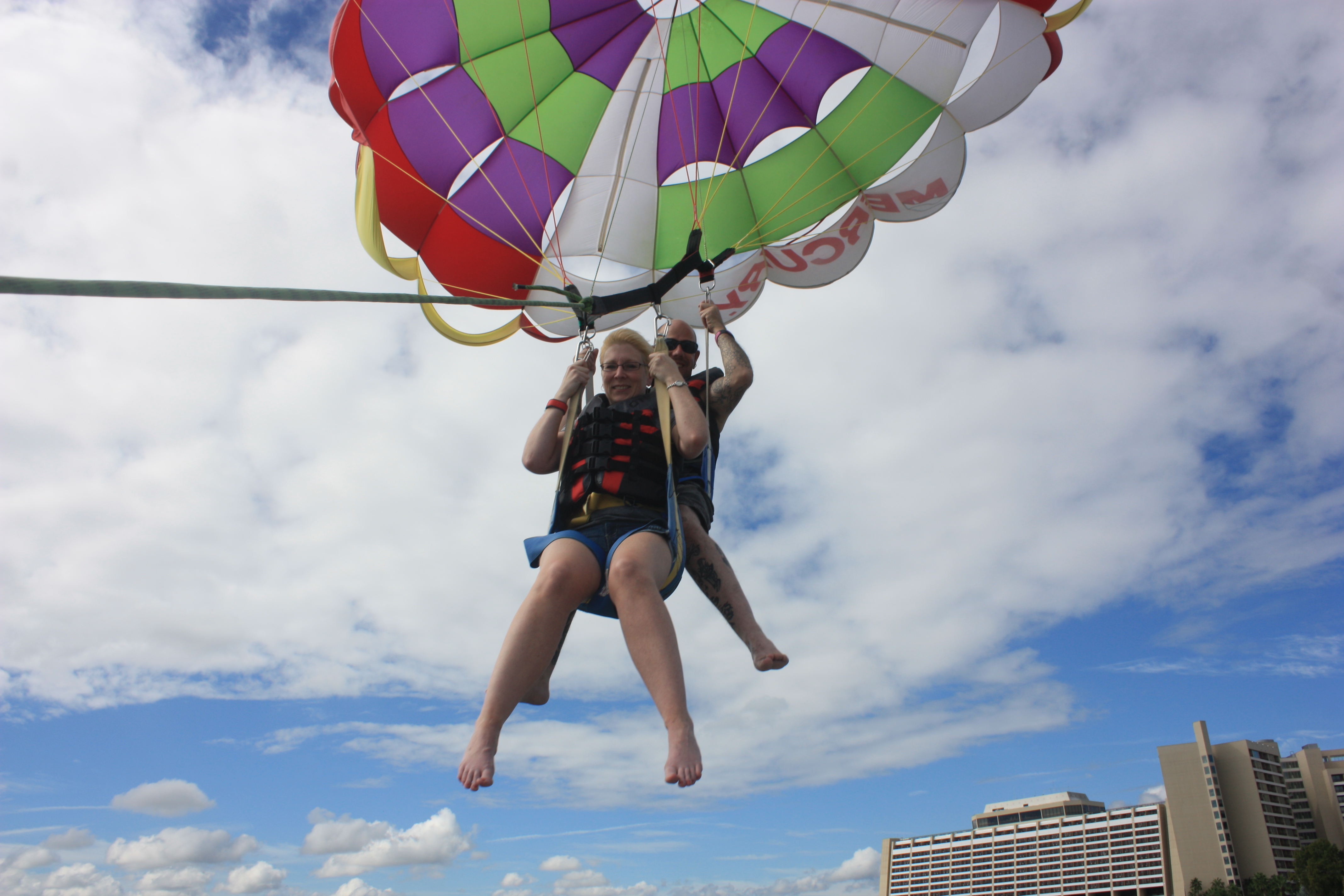 The day we were to parasail dawned clear and bright and with it my fears returned with vengeance.  Could I really do this?  Could I allow myself to go 400 feet up in the air and watch my feet dangle with nothing below me but Bay Lake?